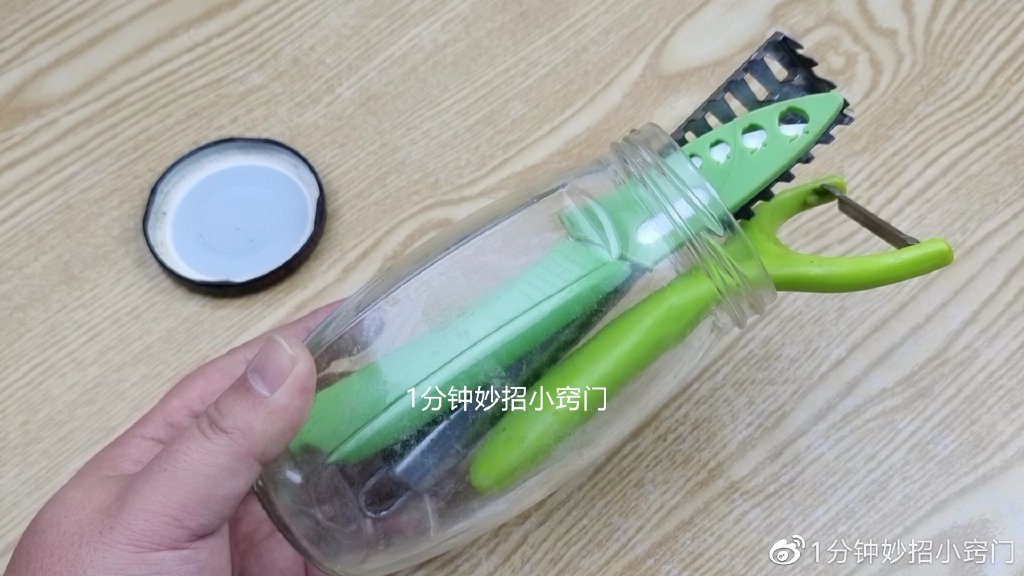 第三个用途,我们还可以用玻璃瓶,收纳厨房里面的一些小工具,厨房里面的小工具比较多,水果刀具,叉子,削皮刀等等,平时用到的时候,找起来也比较麻烦,现在放在玻璃瓶里面集中收纳,拿取就会更加方便。