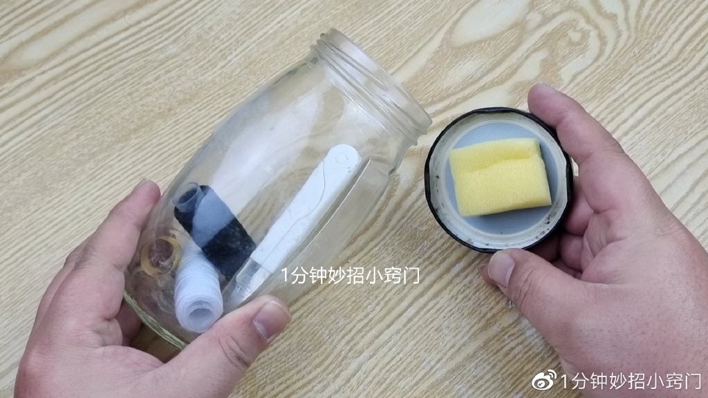 第四个用途,我们准备一块海绵,或者百洁布,用双面胶,把它固定在瓶盖的上面,把绣花针插在海绵上,用来收纳绣花针,而玻璃瓶里面就可以直接装一些扣子,软尺,线卷,等一些用来缝补的配件,这样一个自制的针线收纳罐就制作好了。