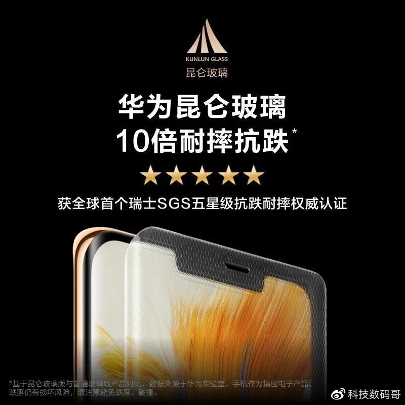 昆仑玻璃是华为与合作伙伴推出的一项技术,去年9月份由华为Mate50系列全球首发。按照官方介绍,昆仑玻璃经历108道微晶原材料及加工程序,全球首个获得瑞士SGS五星抗跌耐摔认证,硬度是常规玻璃10倍左右,让手机变得更坚固。