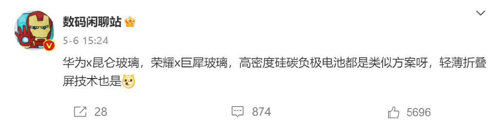 据博主数码闲聊站爆料,荣耀许多技术都是为了对标华为,例如华为旗舰手机有昆仑玻璃,荣耀手机要推出巨犀玻璃;华为有高密度硅碳负极电池,荣耀手机也有青海湖电池;华为Mate X3折叠屏只有不到240克重量,荣耀新品也不遑多让。