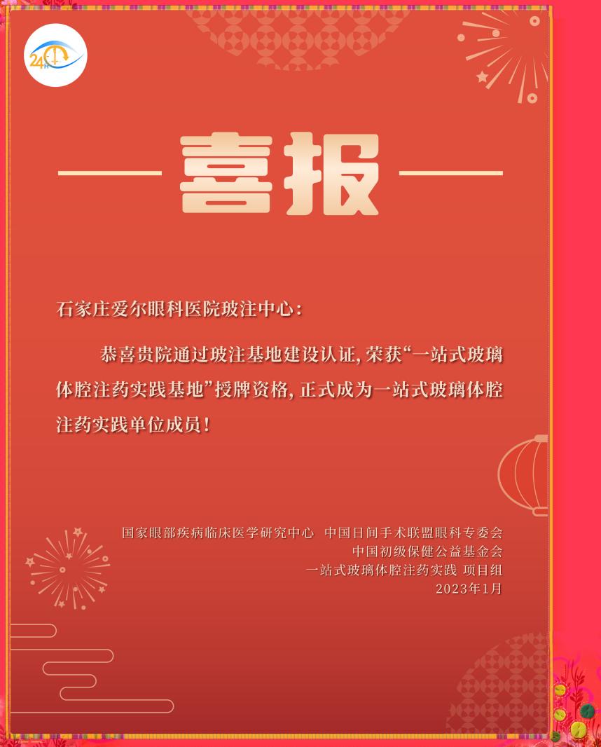 石家庄爱尔眼科医院眼底病科,以马景学教授担任学科带头人,拥有一支以综合眼病为方向的眼科医师团队,配有多种国内外手术和检查设备,设有爱尔眼科疑难眼病专家门诊、糖尿病眼科专科门诊,在糖尿病视网膜病变、视网膜脱离、黄斑疾病、视神经疾病、玻璃体疾病及眼外伤等方面,有着丰富和成熟的诊治经验。在入驻省会石家庄十余年的医疗进程中,服务了数万名眼底病患者,颇受好评,得到了业界的广泛认可。特此,经一站式玻璃体腔注药实践项目组专家综合评定,授予该项目的开展资格。