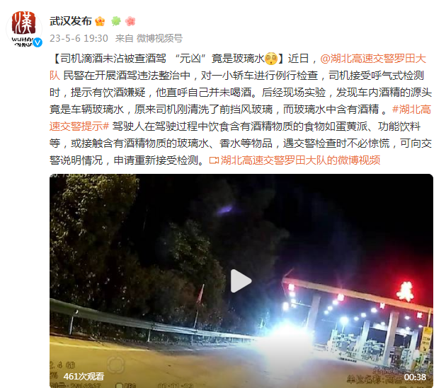近日,@湖北高速交警罗田大队 民警在开展酒驾违法整治中,对一小轿车进行例行检查,司机接受呼气式检测时,提示有饮酒嫌疑,他直呼自己并未喝酒。后经现场实验,发现车内酒精的源头竟是车辆玻璃水,原来司机刚清洗了前挡风玻璃,而玻璃水中含有酒精 。湖北高速交警提示:驾驶人在驾驶过程中饮食含有酒精物质的食物如蛋黄派、功能饮料等,或接触含有酒精物质的玻璃水、香水等物品,遇交警检查时不必惊慌,可向交警说明情况,申请重新接受检测。