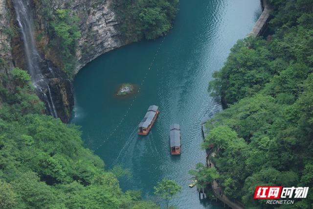 5月2日,游客乘船在张家界大峡谷风景区游览。