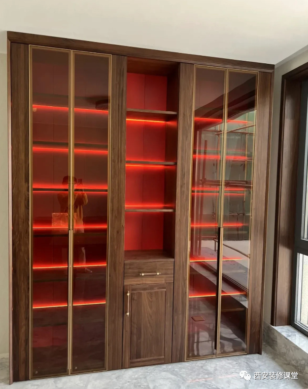 ▲胡桃木的实木柜子,做了玻璃柜门,灯光打上以后彻底翻车,连实木也变得廉价了
