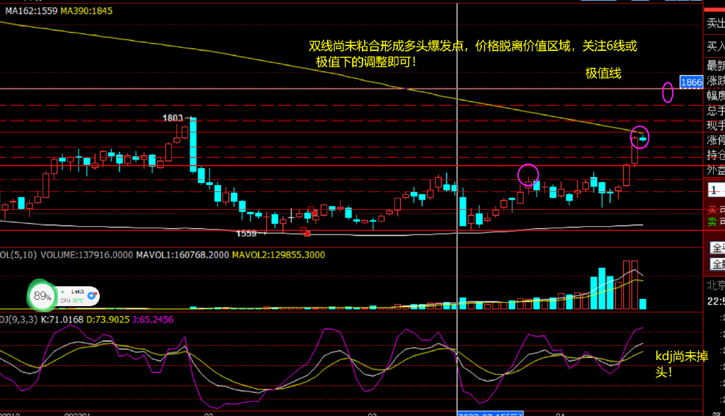 当k线抵达极值带,日线kdj进入超买区域,也就是j线上百,kd开始粘合!