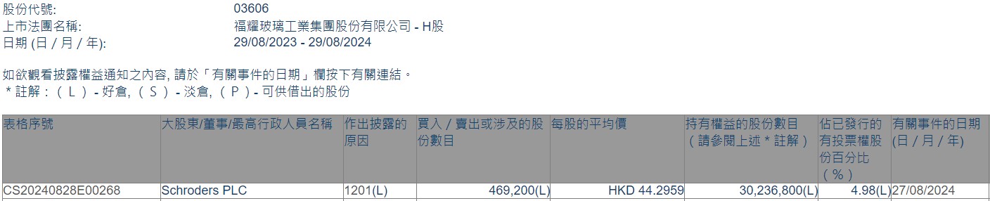 香港联交所最新资料显示,8月27日,Schroders PLC减持福耀玻璃(03606)46.92万股,每股作价44.2959港元,总金额约为2078.36万港元。减持后最新持股数目为3023.68万股,最新持股比例为4.98%。