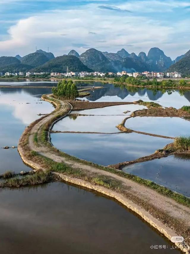 在塘北村拍完好看的照片,就可以驱车前往会仙镇玻璃田,导航“临桂区会仙镇沐宦头村”即可,到达村口后可根据指示牌,沿着石阶登山约50分钟至“西山韶乐”观景台俯瞰全景。