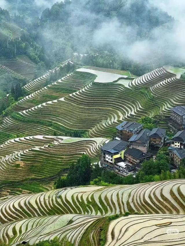 除了会仙、塘北两处玻璃田美景之外,五月中旬左右,龙脊梯田在春末夏初迎来灌水期,当别具特色的梯田蓄满清水时,便形成了规模宏大、气势磅礴的龙脊玻璃田。从金坑大寨或平安寨的观景台望去,依山而筑的梯田层层叠叠,闪耀着天光,宛如无数碎镜铺就的天梯,盘绕至云雾缭绕的山巅。