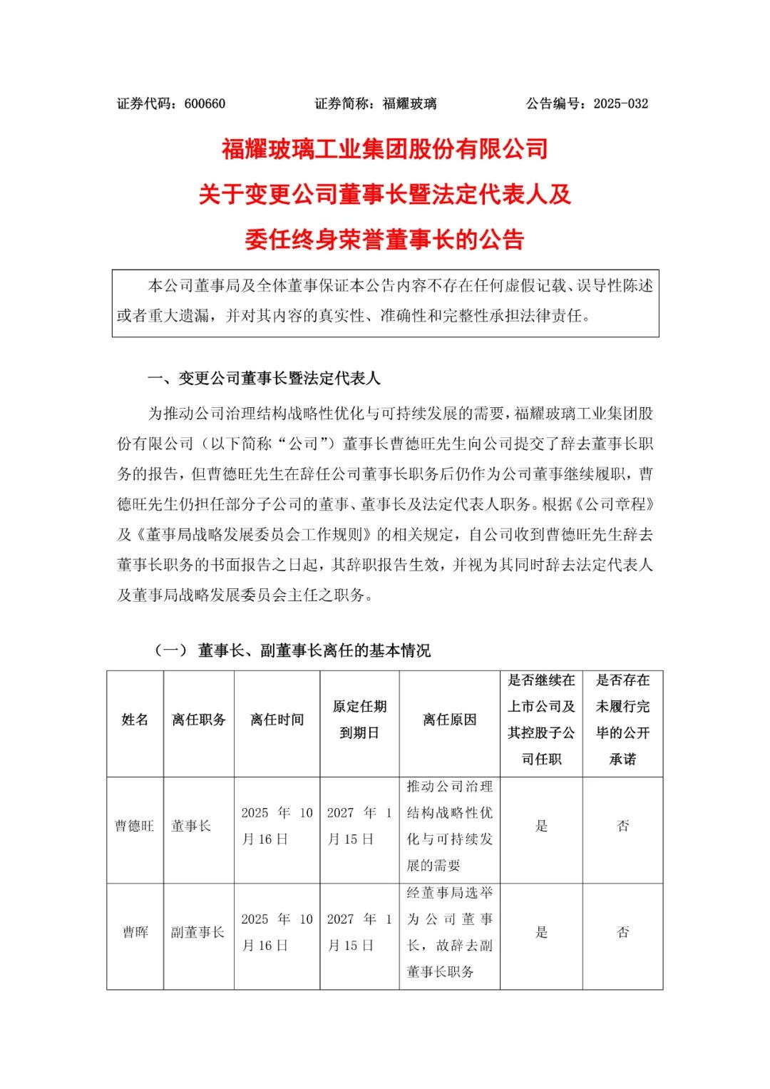 10月16日,福耀玻璃发布公告称,为推动公司治理结构战略性优化与可持续发展的需要,福耀玻璃董事长曹德旺向公司提交了辞去董事长职务的报告,但曹德旺在辞任公司董事长职务后仍作为公司董事继续履职,曹德旺仍担任部分子公司的董事、董事长及法定代表人职务。